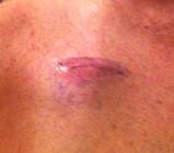 Still red, but will clear up and be nearly invisible.  They say this is the safest most effective way to get the stuff they need to in/out.  The chemo cocktail is so toxic that if it leaks into/onto your tissue (rather than going into your blood) it can damage it permanently!
